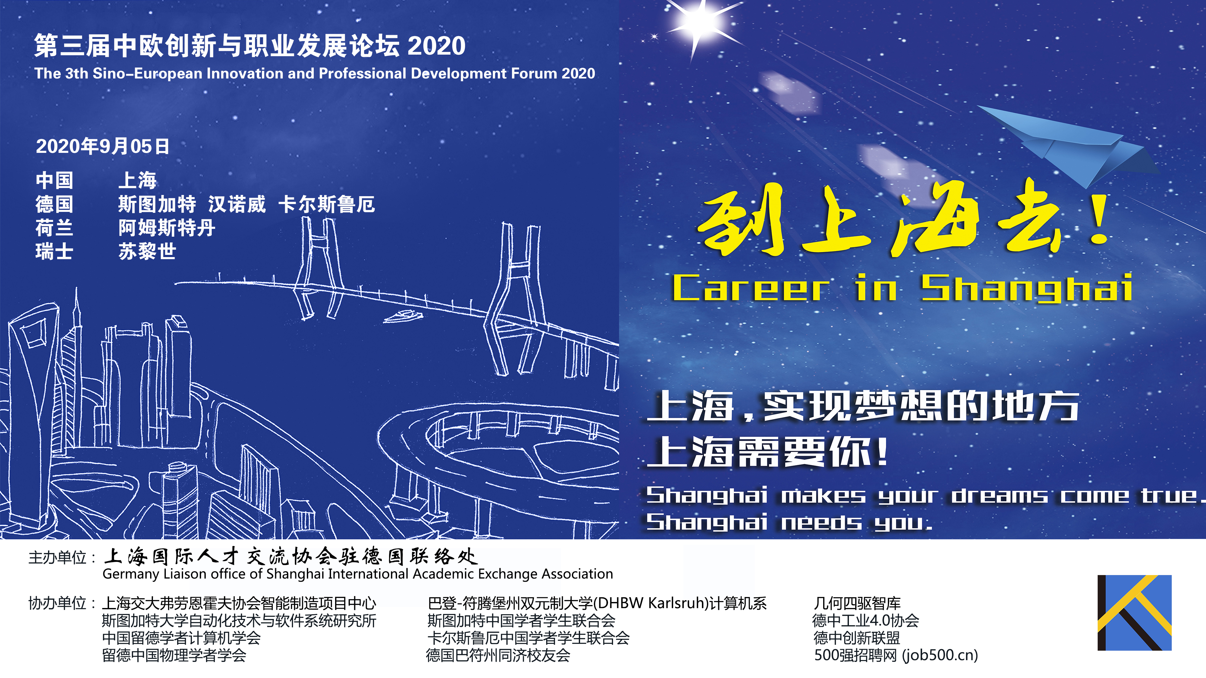 2020 09-05 The 3rd "Career in Shanghai" Sino-European Innovation and Professional Development Forum 2 2020年9月5日,第三届中欧创新与职业发展论坛 2020于线上和斯图加特,汉诺威,卡尔斯鲁厄,上海的线下会场启幕 上海国际人才交流协会